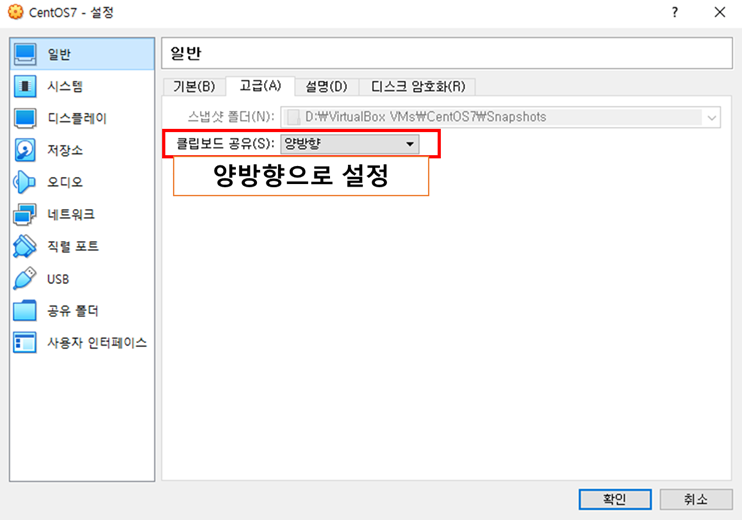 설정창 내, 클립보드 공유를 양방향으로 설정해 줍니다. 양방향은 가상 머신에서 복사한 클립보드 내용도, 호스트에서 사용할 수 있도록 설정한다는 뜻입니다. (양방향으로 복사, 붙여 넣기 가 가능해집니다.)