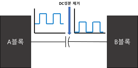 캐패시터는 분리된 별도 회로간에 신호를 연결 할 때도 사용됩니다. 다음과 같이 분리된 A블록과 B블록이 있고, A블록의 신호하며 신호라인에 있는 DC성분을 제거하고 순수한 신호만 보내야 한다면, 그림과 같이 캐패시터를 연결하여 DC를 제거하는 방법을 사용합니다