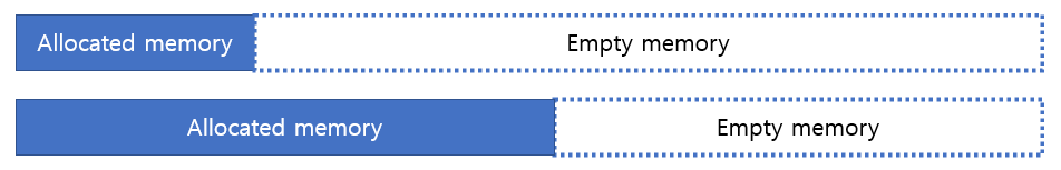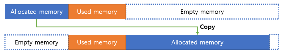 이미 할당된 메모리공간 뒤에 빈 공간이 있을 경우, OS는 추가 요청된 메모리 공간을 기존 메모리 공간 뒤에 함께 사용할 수 있도록 배치해 줍니다. 하지만 빈 공간이 없을 경우, OS는 그 할당 위치를 모두 옮기게 됩니다.