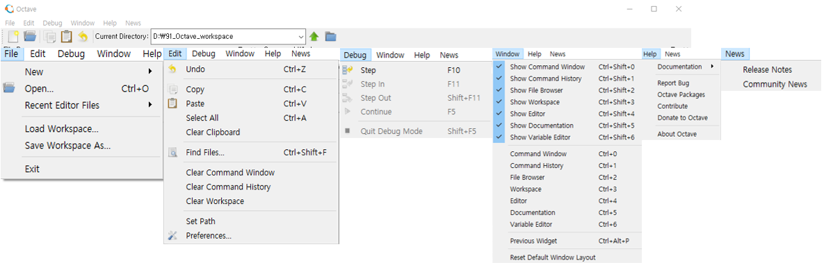 Octave의 상단바는 File, Edit, Debug, Window, Help, News로 구성되어 있습니다. File 창은 새로만들기, 파일 열기 등의 기능으로 구성되어 있으며, Edit창은 되돌리기(Undo), 복사/붙여 넣기 등의 기능으로 구성되어 있습니다. Debug는 옥타브 디버깅을 위한 창으로 구성되어 있습니다. Window는 각종 창을 켜고 끄기 위한 기능으로 구성되어 있습니다. (만약 필요한 창이 보이지 않으시다면 위 설정에서 체크가 해제되지 않았는지 확인하시면 됩니다.) Help는 옥타브 관련 문서, package 등 기능을 확인하기 위해 사용할 수 있습니다. News는 옥타브 관련 공지사항 혹은 패치 노트를 확인할 수 있는 창입니다.