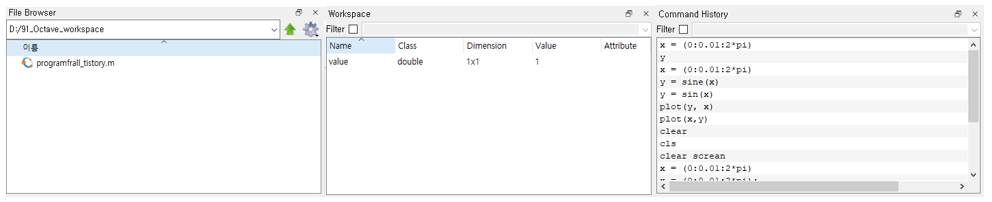 Octave의 좌측에서는 각종 유용한 창들을 확인할 수 있습니다. File browser에서는 경로 내 현재 파일상태들을 보여줍니다. Workspace에서는 현재 사용되는 변수의 이름, 타입, 차원(행렬), 현재 값 등을 확인할 수 있습니다. Command History에서는 현재까지 사용한 명령어들을 과거부터 현재까지 보여줍니다.