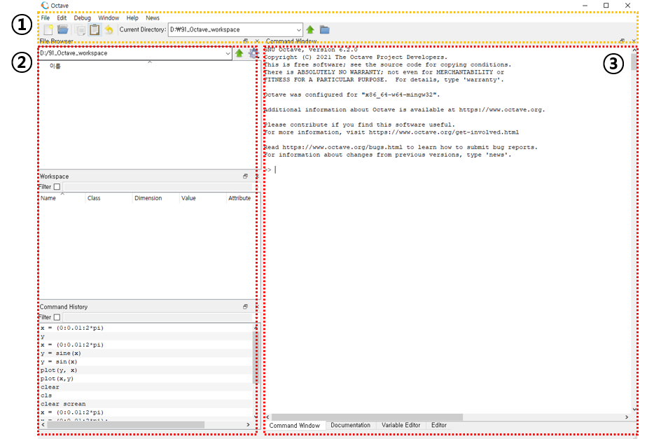 (1) 번 영역은 기본적인 새로 만들기, 파일 저장 등 옥타브가 처리할 수 있는 기능들을 모두 정리해둔 상단 바입니다. 또한 현재 작업이 이루어지는 위치(디렉터리, Current Directory)도 확인할 수 있습니다. (2) 번 영역은 각종 유용한 창들이 위치한 영역으로, 파일 탐색기(File Browser) , 현재 사용되고 있는 변수들을 보여주는 워크스페이스(Workspace), 과거 명령어들을 보여주는 히스토리 창(Command History)으로 되어 있습니다. (3) 번 영역은 작업 창으로, 콘솔 창과 변수 에디터, 그리고 데이터로 구성되어 있습니다. 그럼 각 창에 대해서 좀 더 자세히 알아보도록 하겠습니다.
