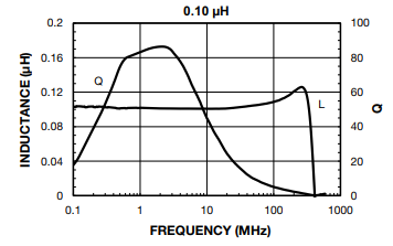 또한 현재 대상이 되는 회선의 주파수 특성을 확인하여, 주파수 특성에 따라 성능이 떨어지지 않는지 확인해야 합니다. 일반적으로 인덕터는 일정 주파수 까지는 일정한 인덕턴스 값을 보여주지만, 주파수가 상승함에 따라서 점점 인덕턴스가 증가하다가, 한계에 부딪치게 되면 인덕턴스가 사라지는 특성이 있습니다. 이는 각 인덕터의 데이터 시트 (Data sheet)를 통해 확인할 수 있습니다. 아래는 한 인덕터의 주파수별 인덕턴스 특성 그래프입니다.