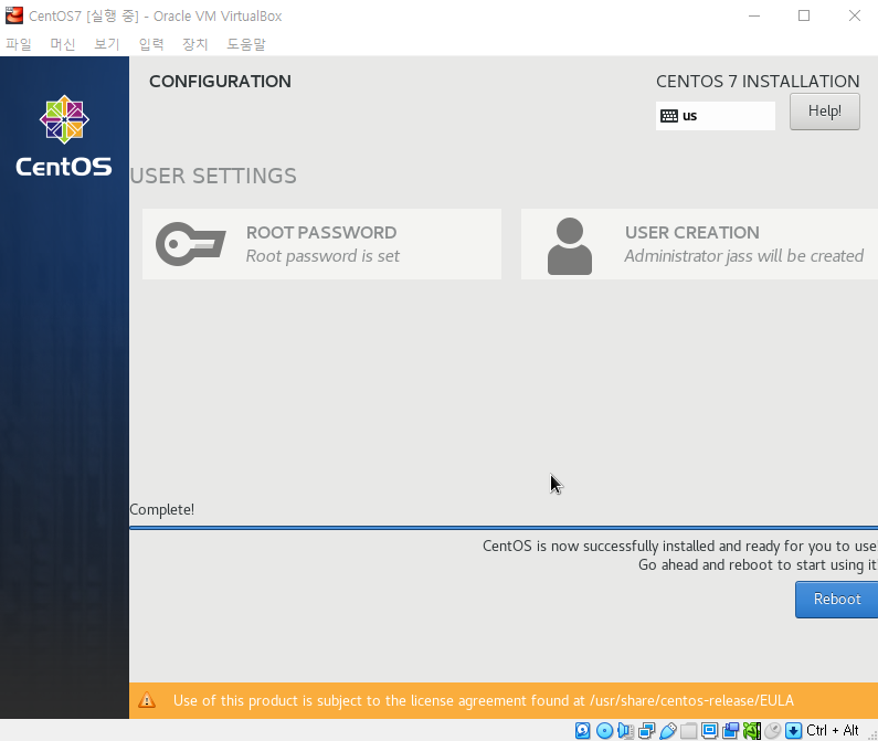 설치가 완료되면 하단에 Finsh configuration이라는 버튼이 생성됩니다. 버튼을 클릭하여 설치를 마무리합니다. 이후 Reboot 버튼을 클릭하여 재 시작합니다.