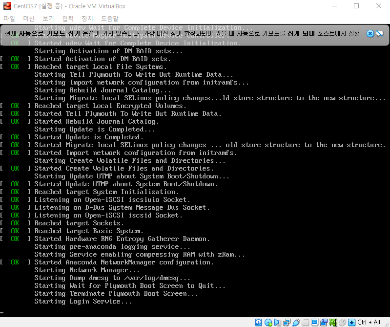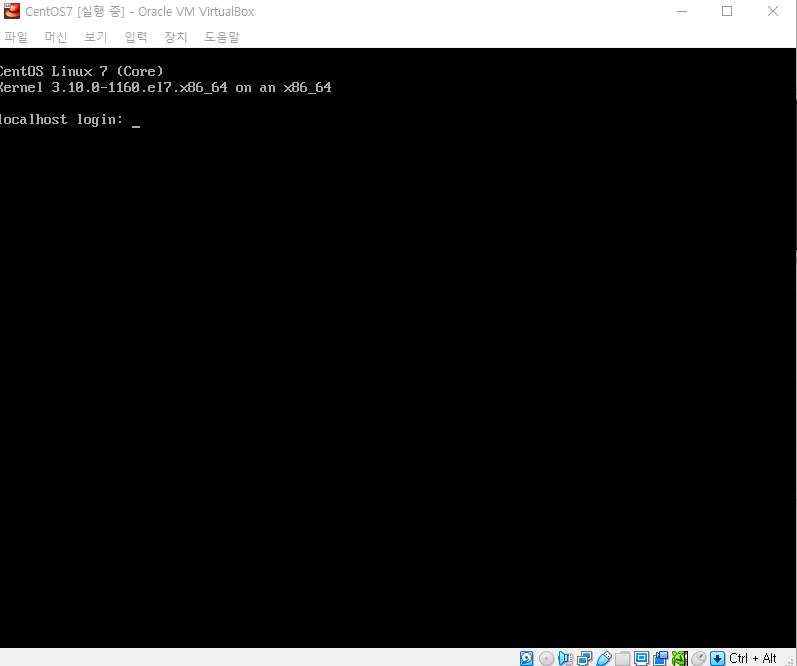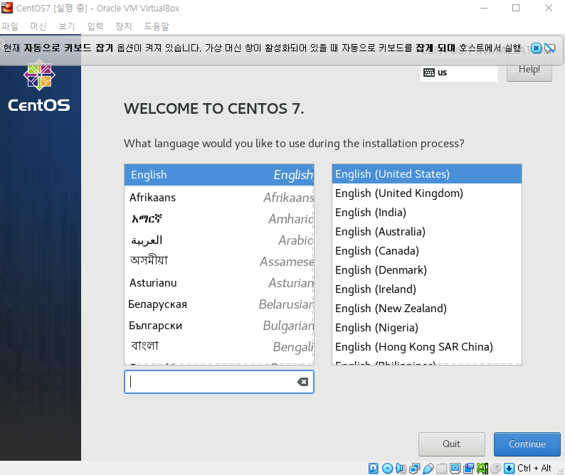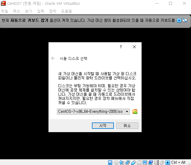 가상 머신이 동작하면, 다운 받은 iso 파일을 시동 디스크로 선택하고 시작을 클릭합니다. 시작을 클릭하면 아래와 같은 창이 나타나며, Install CentOS 7을 클릭하여 설치를 진행합니다. 참고로 초기 상태에서는 포커스가 가상 머신에 있을 때 마우스 탈출 버튼이 Right Ctrl으로 되어 있습니다. 저는 습관상 ctrl + Alt가 익숙하여 이 키로 변경하였습니다. 혹시 마우스가 빠져나오지 않는다면, ctrl + Alt + delete키로 작업 관리자를 켠 후, 자연스럽게 빠져나온 포커스로 마우스를 제어하시면 됩니다.