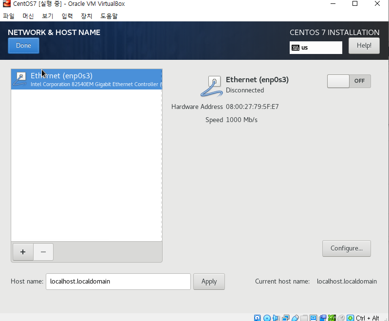 인터넷 : Network & Host NAME 을 클릭 한 뒤, Ethernet(enp0 s3)를 On으로 설정