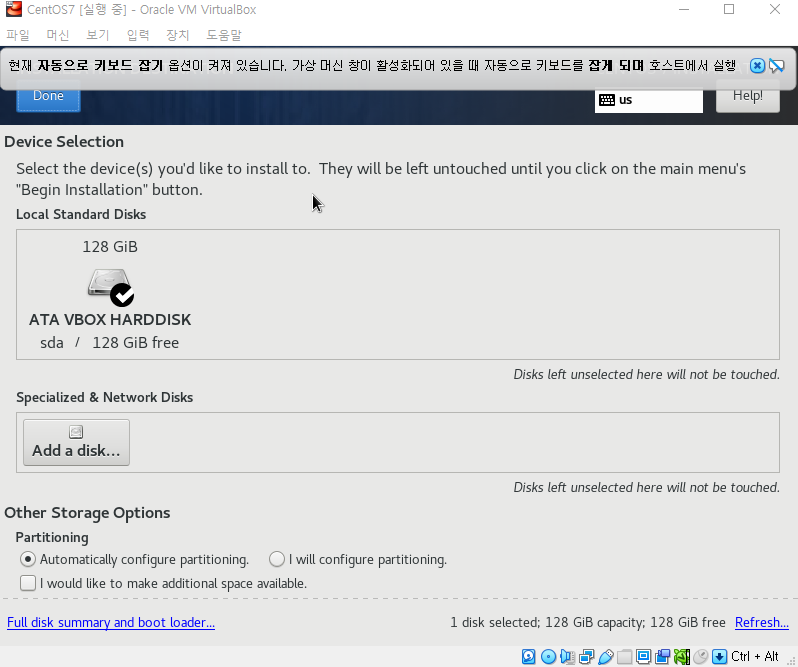 생성한 가상 디스크를 설치 위치로 설정한 뒤 Done을 클릭합니다. 참고로 저는 가장 Minimal한 상태로 설치를 한 뒤에 인터넷 설정부터 하나하나 하려고 하여 추가적인 조작을 하지 않았지만, 인터넷 및 GUI를 편리하게 설치하시고 사용하시기 위해선,
