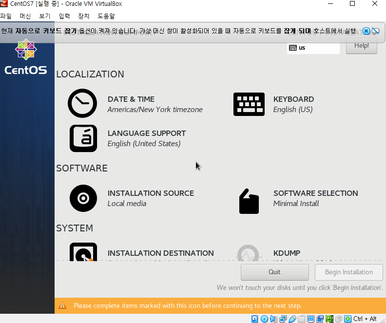 이후 설치에 필요한 기본 설정을 진행하게 됩니다. Localization설정을 통해 시간 및 키보드 설정을 해주시면 되며 Software창을 통해 원하시는 설청으로 설치를 진행하시면 됩니다. 저는 우선 아무것도 건드리지 않고 Minimal install로 진행하도록 하겠습니다. 이 과정에서도 필수적으로 진행해주셔야 하는 부분이 있습니다. 바로 System의 Installation destination부분입니다. 이 부분에 이전에 설정해준 가상 디스크를 설치 위치로 지정해 주셔야 정상적으로 설치가 진행되게 됩니다. (!로 강조표시가 되어 있습니다.)