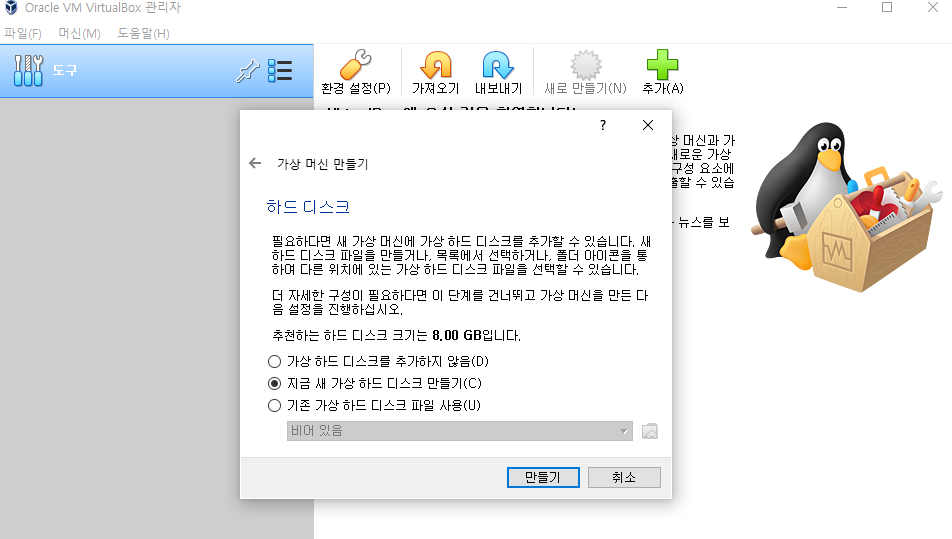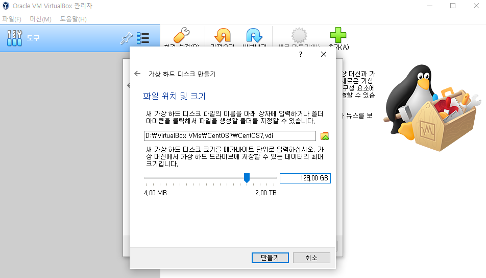 다음 과정으로 하드디스크 설정 창이 나타나게 됩니다. 하드디스크 추천은 8GB이나, 실제로는 기본 패키지만 설치하더라도 용량이 매우 부족하기 때문에 20GB 이상을 추천드립니다. 저는 128GB로 설정하였습니다. 특별한 설정이 필요한 것이 아니라면, 지금 새 가상 하드 디스크 만들기로 체크하고 만들기를 클릭합니다. 다음으로 나타나는 창에서는 VDI를 클릭해주시고, 취향에 따라 동적 할당/고정크기를 선택합니다. 저는 고정 크기로 하여 다음과 같이 설정한 후 만들기를 클릭하였습니다. (고정 크기를 선택하였을 경우, 파일 생성까지 좀 더 시간이 소요됩니다.)