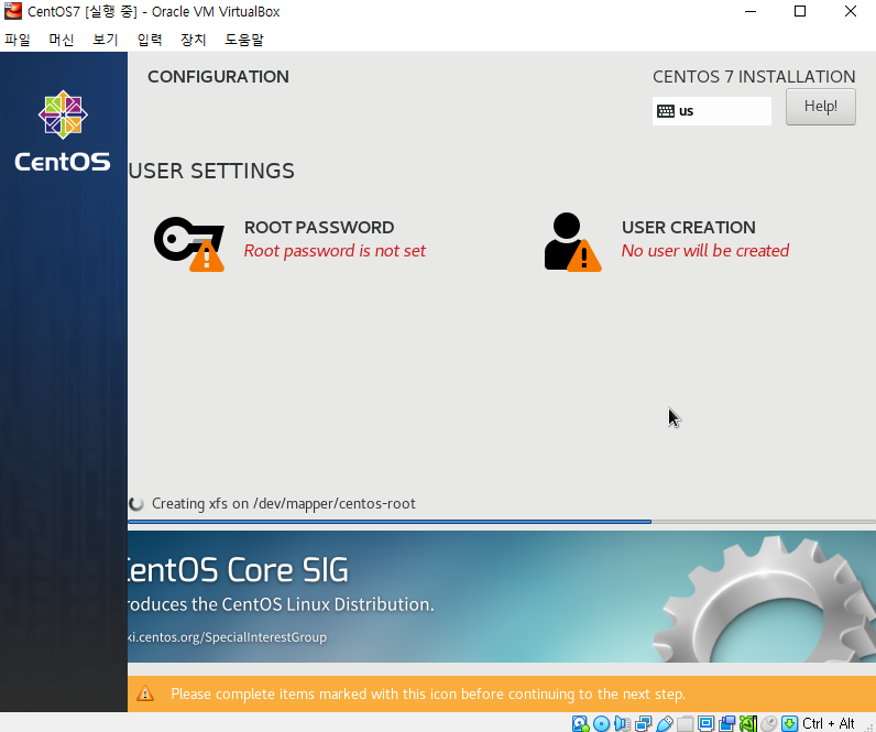 이제 Begin install을 클릭하면 다음과 같은 창이 나타나면서, !로 유저 설정 창이 나타납니다. 설치가 진행되는 동안 유저 설정을 진행해 줍니다. Root 권한 비밀번호와 User생성입니다. User는 관리자로 생성하여 사용하도록 합니다. 기본적으로 linux에서는 절대로 root로 작업을 진행하겠다는 생각을 하지 않으시는 게 좋습니다. 따라서 관리자 유저 계정을 생성하여 모든 작업을 진행하는 것이 좋습니다.(매우 권장됩니다.)