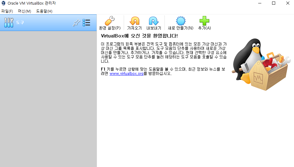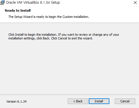 마지막으로 Install을 클릭하여 설치를 진행합니다. 이후 설치를 마무리하게 되면 다음과 같이 Virtual Box가 실행됩니다.