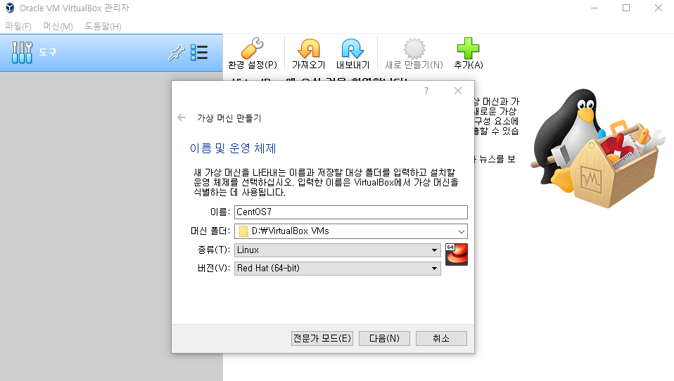 그럼 이제 본격적으로 Virtual Box에 CentOS 7을 설치해보도록 하겠습니다. 위에서 설치한 Virtual Box 실행 화면 상단에서 새로 만들기 버튼을 클릭합니다. 새로 만들기 버튼을 클릭하면 다음과 같인 창이 나타나게 됩니다.