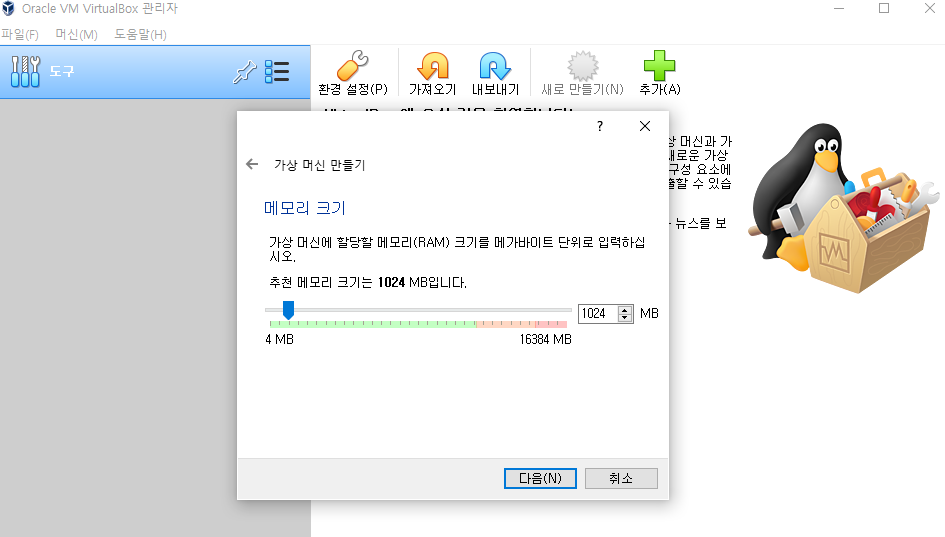 다음을 클릭하면 메모리 크기를 선택해달라는 창이 나타납니다. 본인 PC환경에 맞추어 메모리 설정을 바라며, 저는 4GB를 설정하도록 하겠습니다. 설정 후 다음을 클릭합니다.