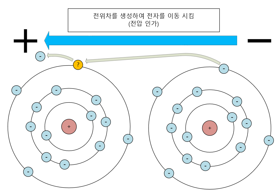 N형 반도체의 이동 원리를 간단히 설명하면 아래와 같습니다. 전자가 있는 N-형반도체에 전위차를 가해 에너지를 넣어주게 되면, 전자는 전위를 따라 이동하게 되고 이러한 전자의 이동이 전류의 흐름을 만들어 주게 됩니다.